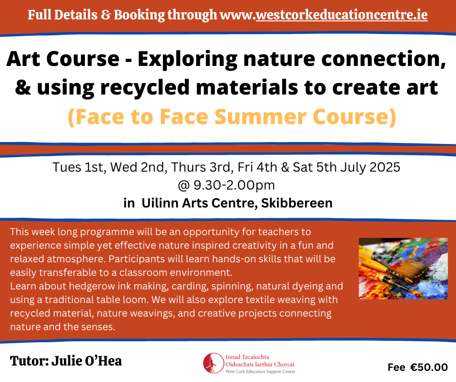 This weeklong programme will be an opportunity for teachers to experience simple yet effective nature inspired creativity in a fun and relaxed atmosphere. Participants will learn hands-on skills that will be easily transferable to a classroom environment.